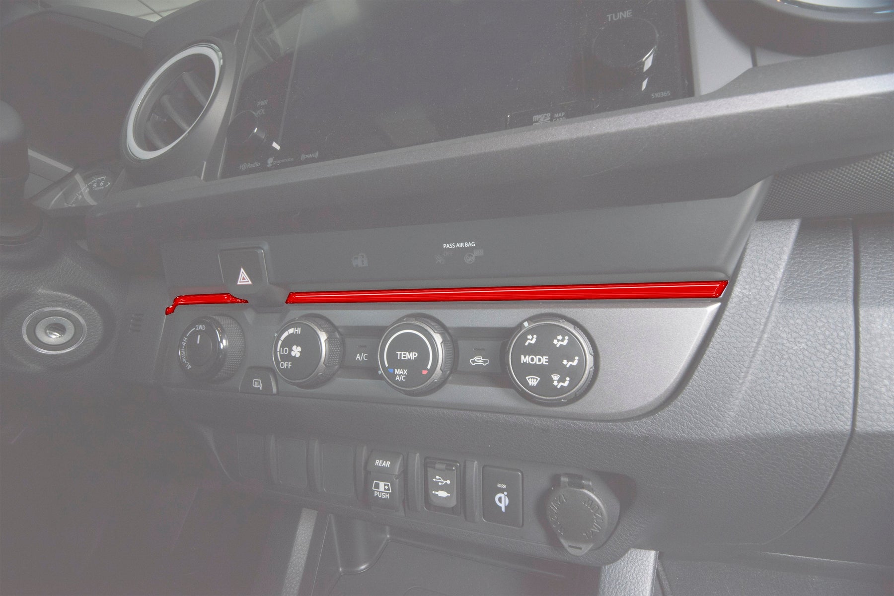 Add a new interior look to your Toyota Tacoma by installing TUFSKINZ Strip Above Climate Control Accent Overlay. This kit adds style and protection to your vehicle and is fittingly positioned above the climate controls.