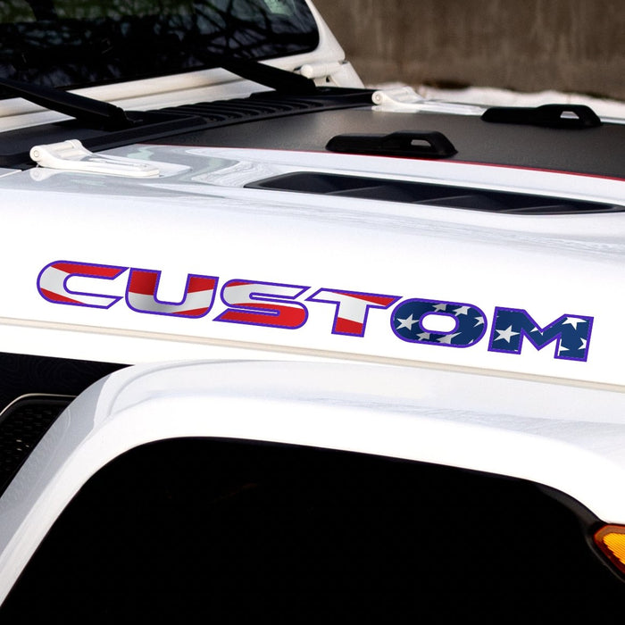 Includes: (2) Custom Text Decals, one for each side of the hood