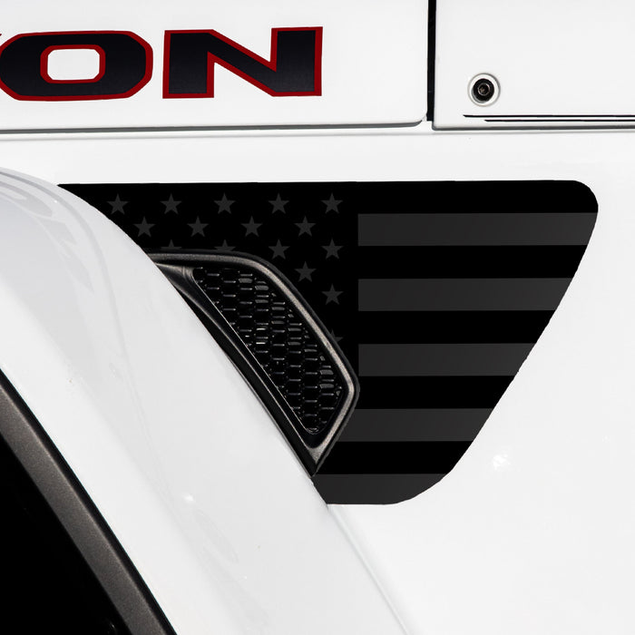 Black on Black American Flag vehicle wrap decal that is precisely and intentionally designed to wrap the recessed part of the fender behind the front fender flares. *Pictured with Rubicon Fenders*