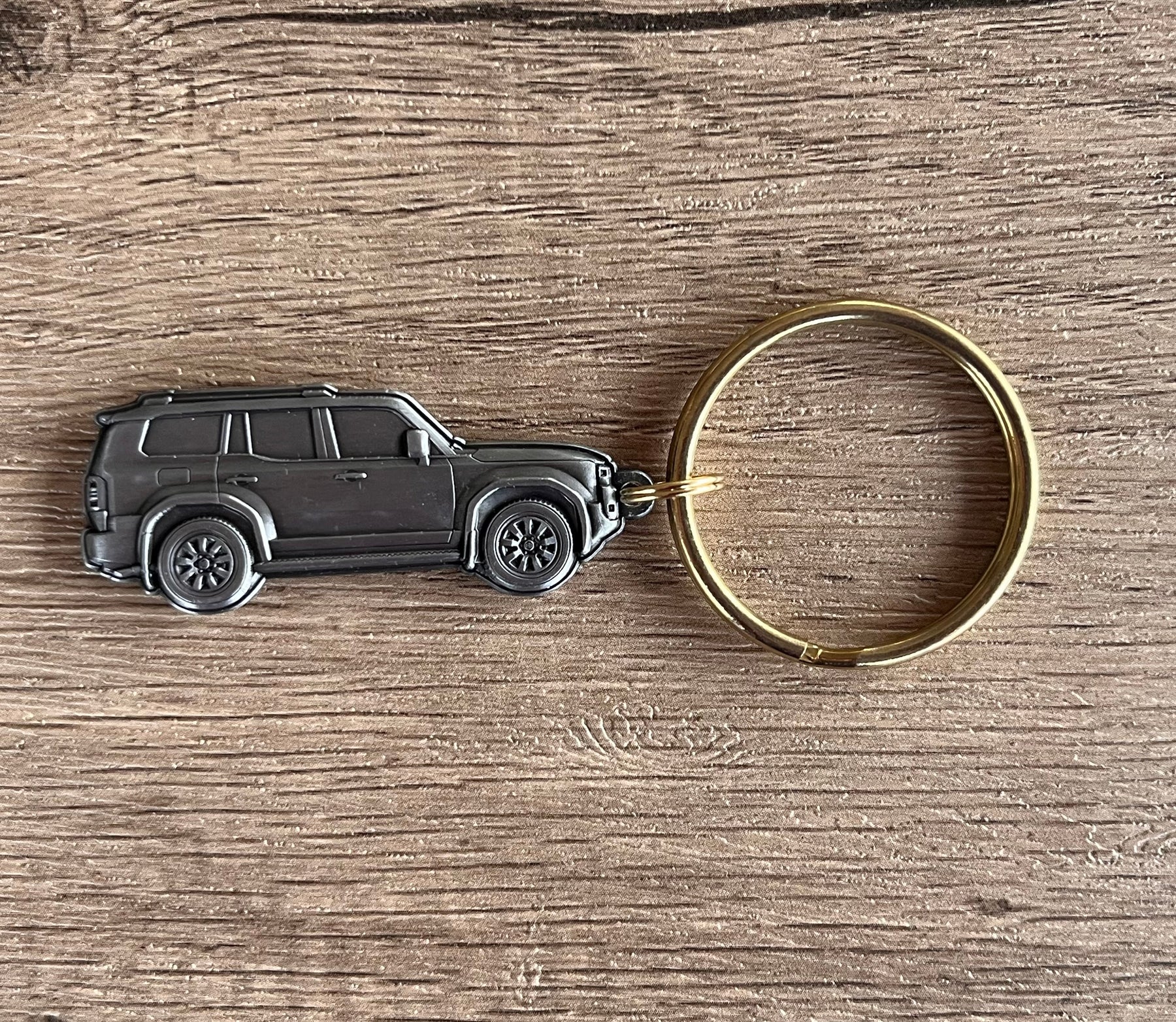 Toyota Land Cruiser J250 2 sided solid metal keychain with incredible detail and antique silver metal finish. The length including key ring is 3.25". The larger key ring makes the length 3.5”.
