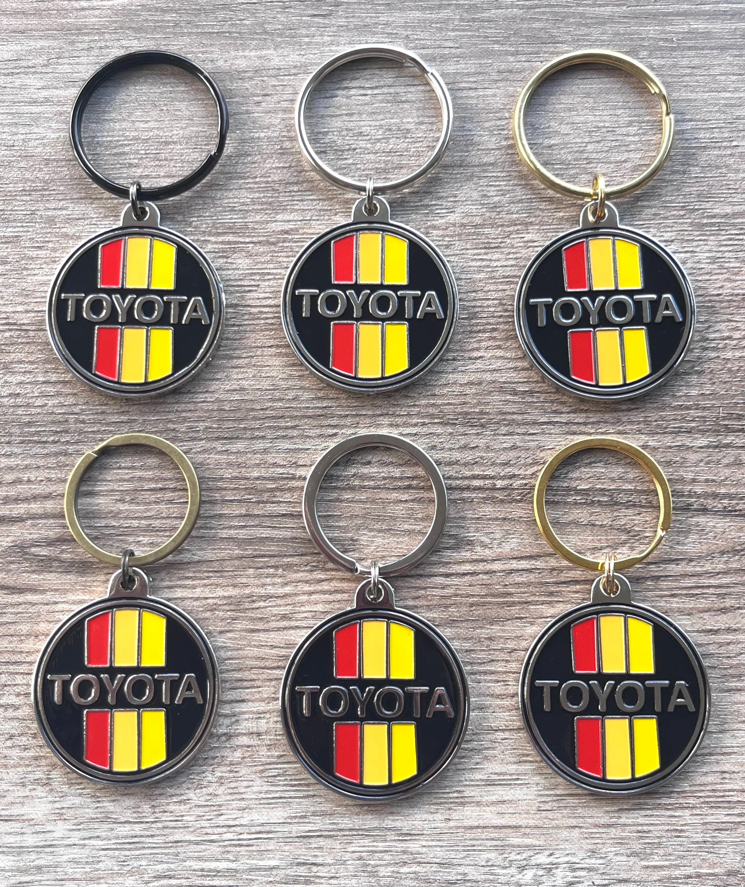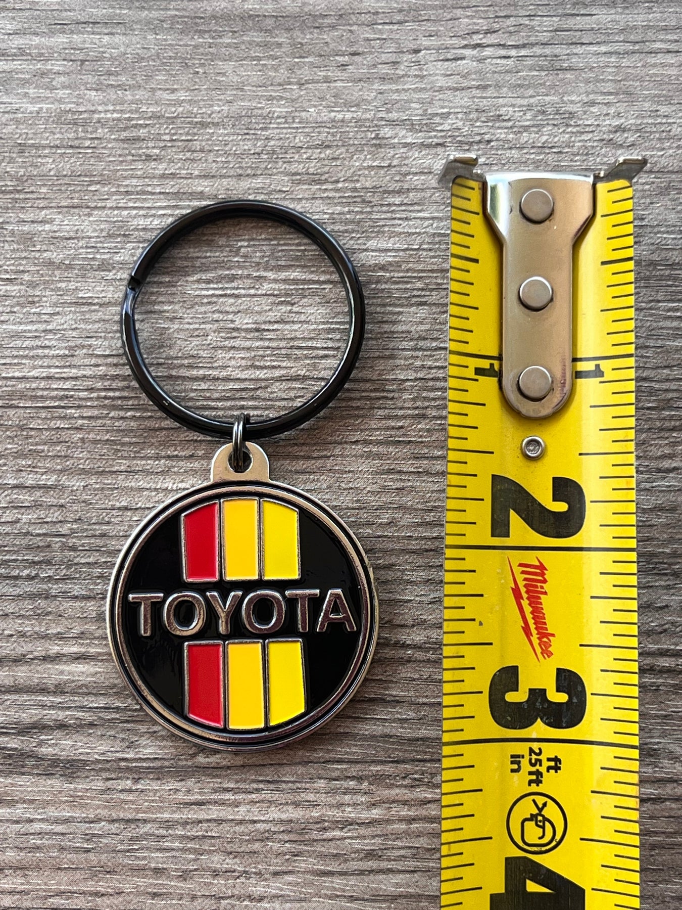 Toyota's old school 3 Stripe logo on a solid metal enameled keychain. The back side is plain metal.