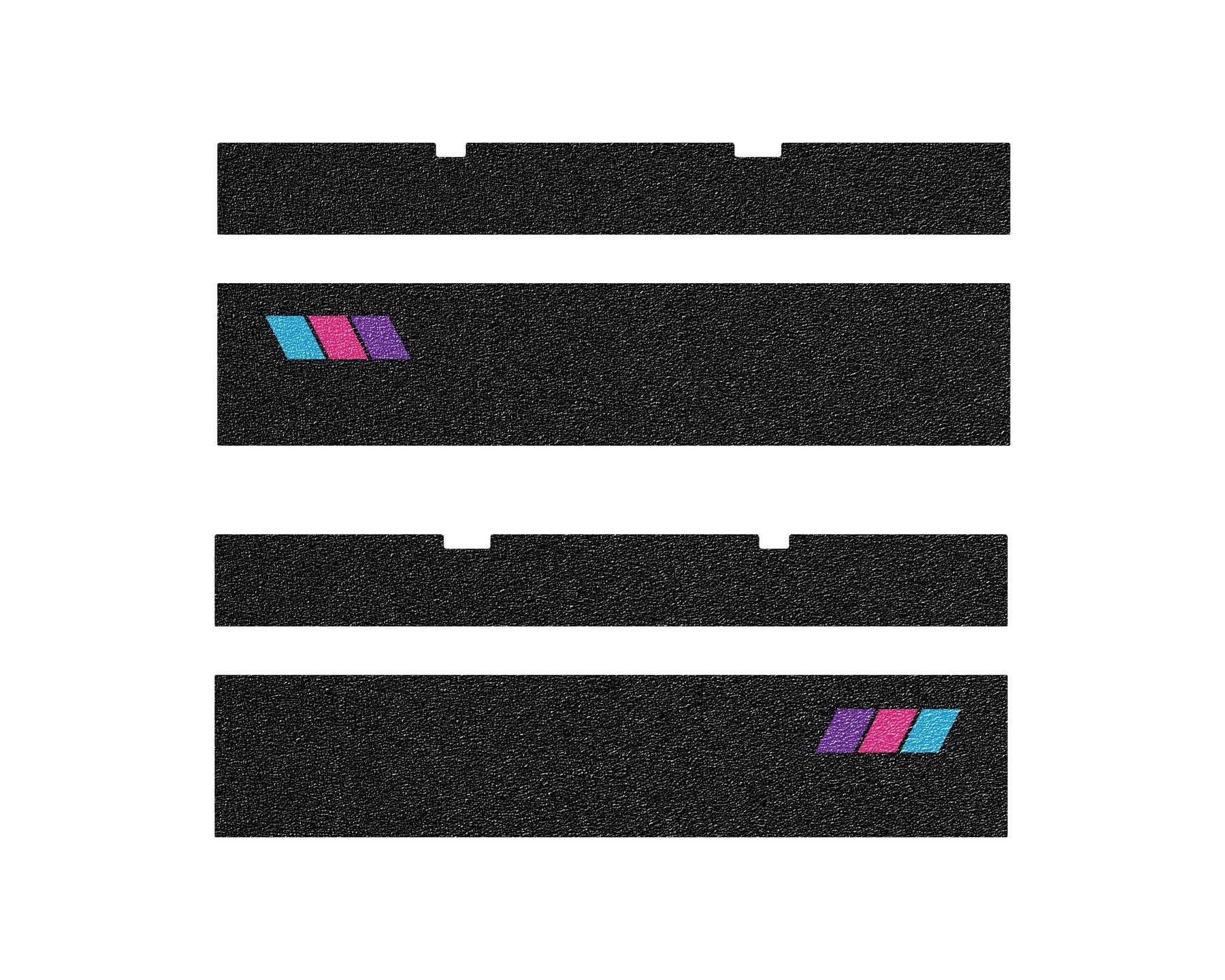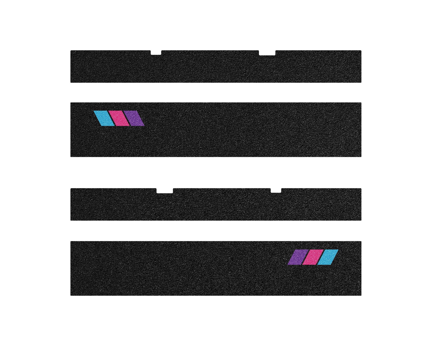 -Our TUF-LINER material which has a similar look/feel as spray in Bed-Liner. Each door sill is backed with a 3M Automotive Grade Adhesive that creates the perfect bond to the surface of the vehicle and makes the product installation an ease.
