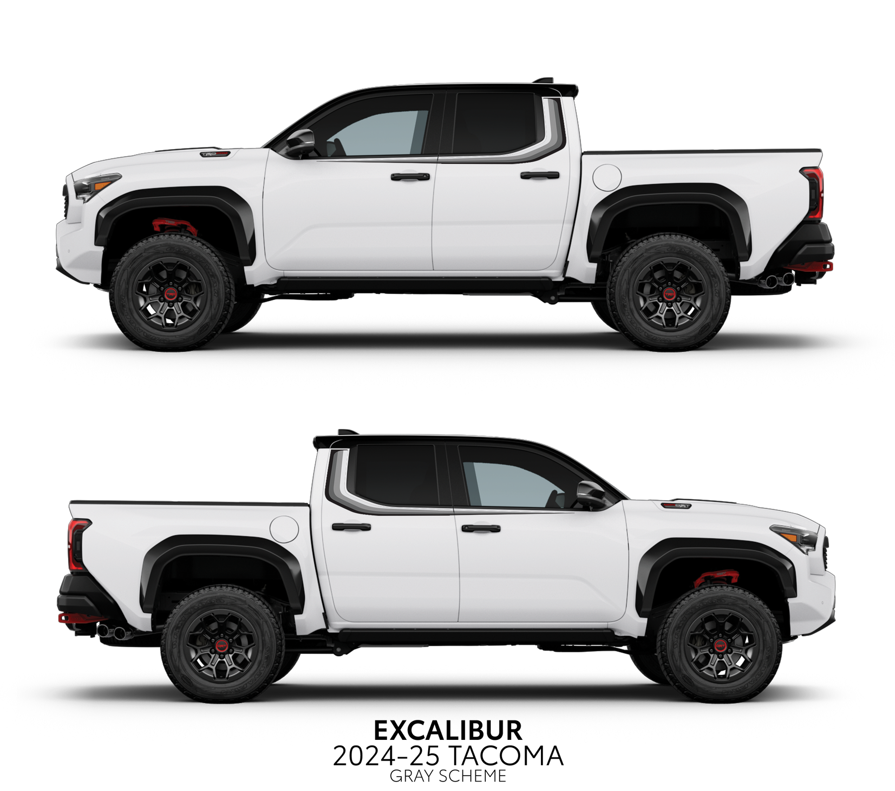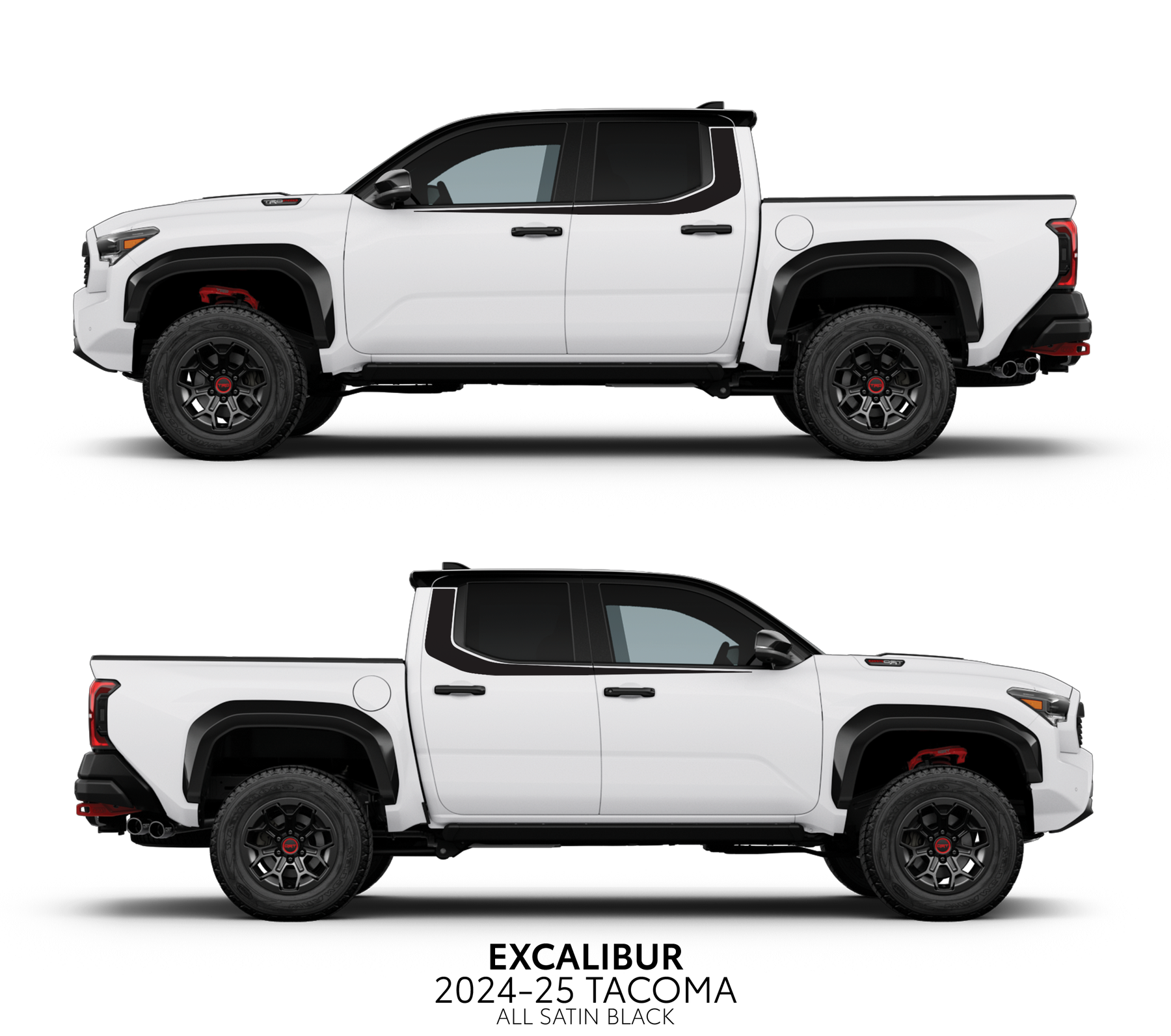 Introducing the Excalibur Decal Kit for the 2024+ Tacoma's. Our kits are designed for easy installation, using high-quality air release vinyl that allows for bubble-free results. Our kit comes in a variety of eye-catching color schemes and a stunning SATIN finish to make your vehicle stand out on the road.