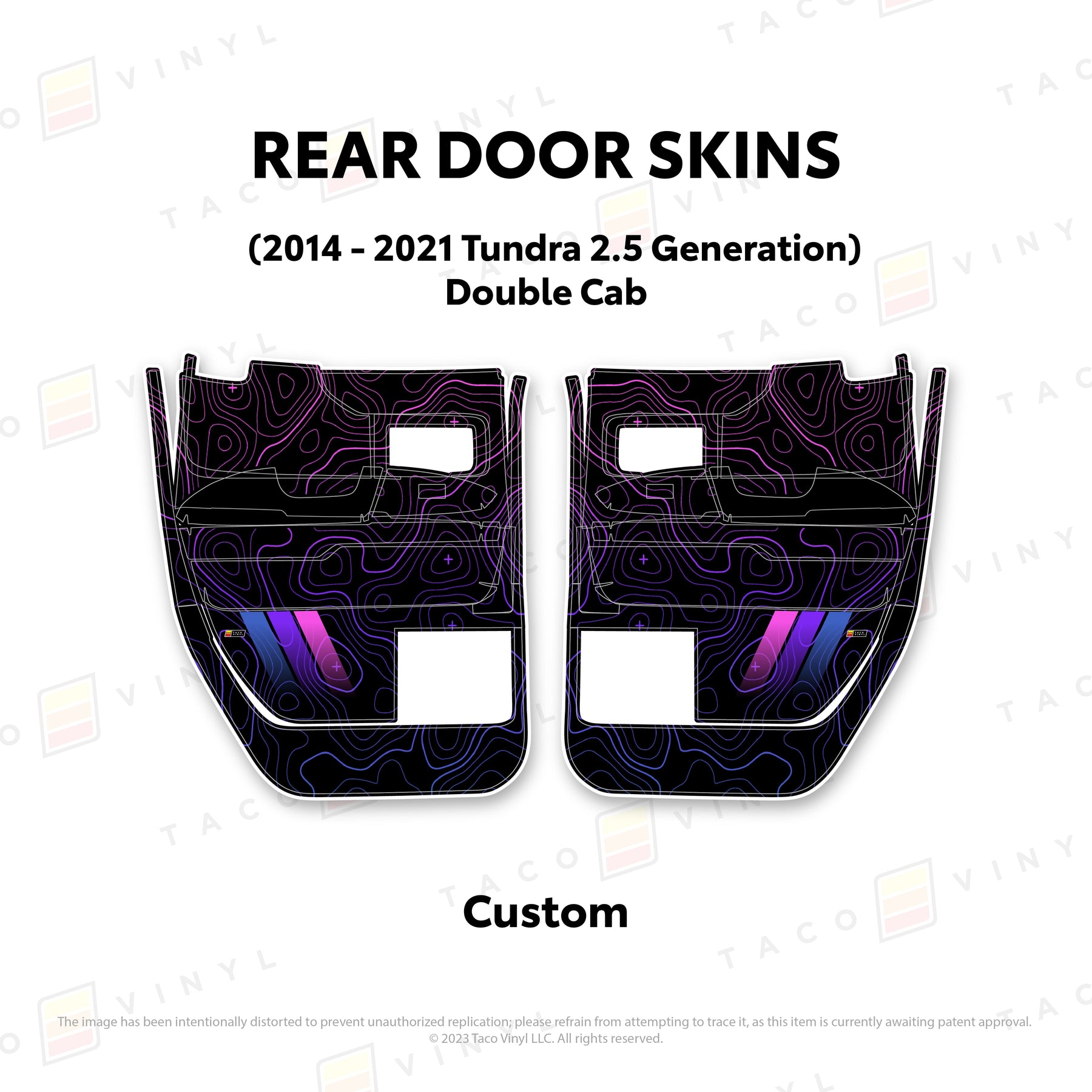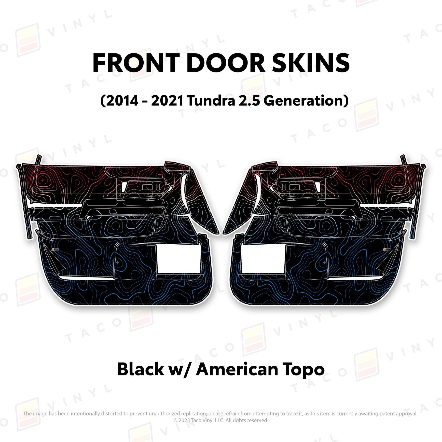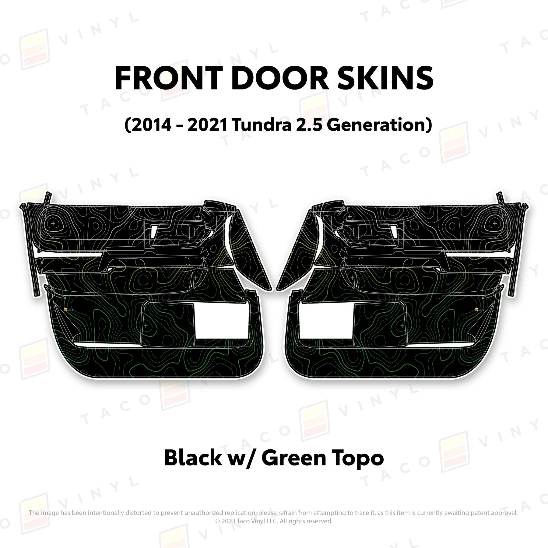Introducing the world's premier door skins tailored for your 2.5 (14-21) generation Tundra. Crafted from top-tier, robust materials, our door skins are engineered to excel. Originally conceived to shield against the rigors of everyday use, from boot scuffs to pet scratches and more, we soon realized their added visual allure. Whether you envision a lifelong partnership with your truck or are on a lease, our door skins ensure the preservation of your door panels while injecting a dash of style into the mix, should you desire.