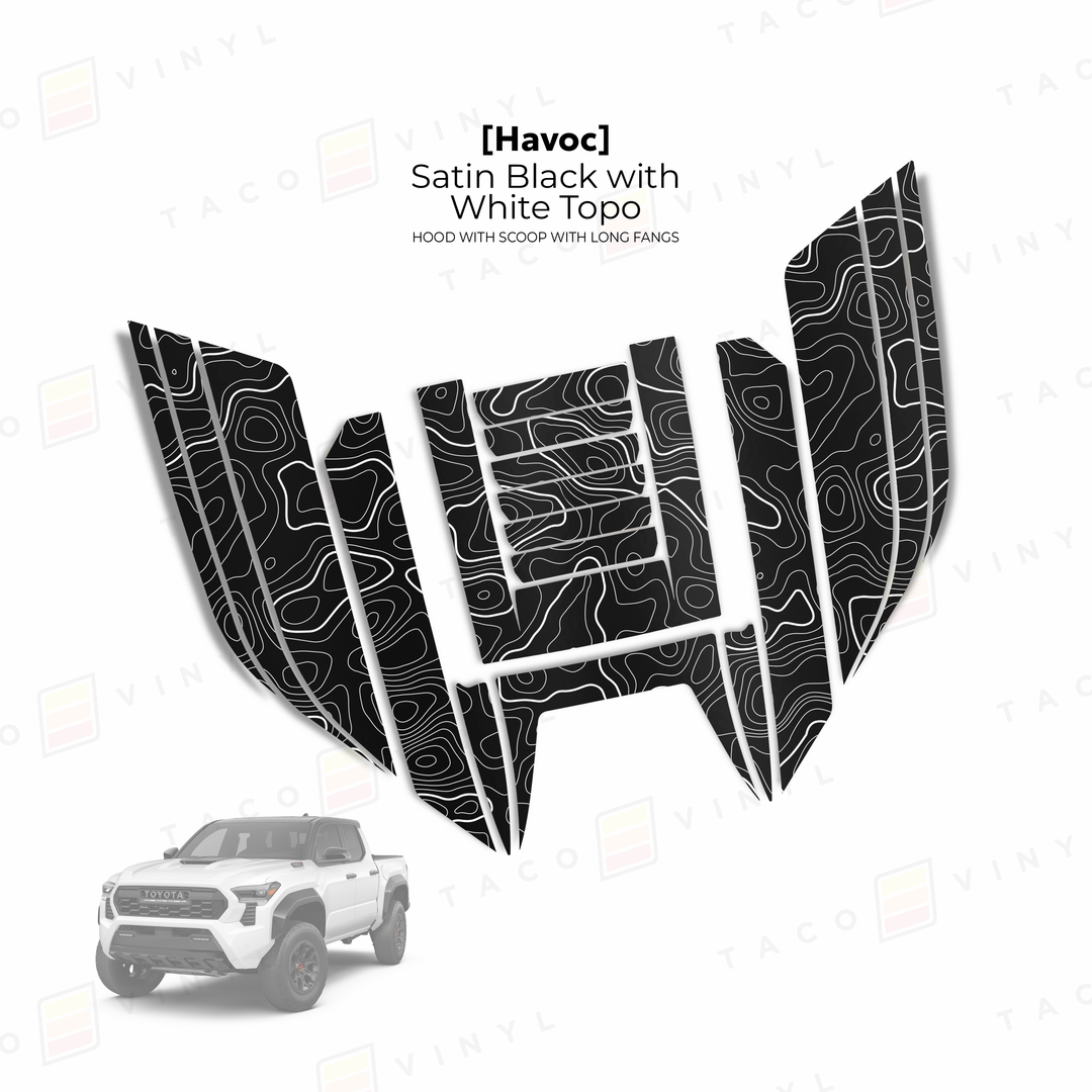 Give your 4th gen Tacoma hood a new look with our Havoc hood stamp decal kit featuring short fangs! This kit comes with 18 pieces that hug the hood lines and is made from the highest quality materials. Each decal comes with application tape to keep everything locked in place. Choose from a variety of killer designs and colors to make your ride stand out. Installation is a breeze with our YouTube tutorials, or let a local wrap shop handle it for you.