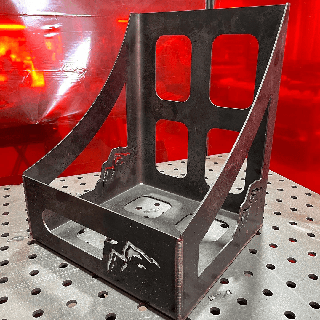 • Materials: The hinge brackets, wheel mounting plate, and swingout wheel support plate & braces are 1/4" hrpo steel. The latch bracket and logo brace are 3/16" hrpo steel. Round tubing is 1.75" OD x 11 gauge ERW. Square tubing is 2.5x2.5x3/16.