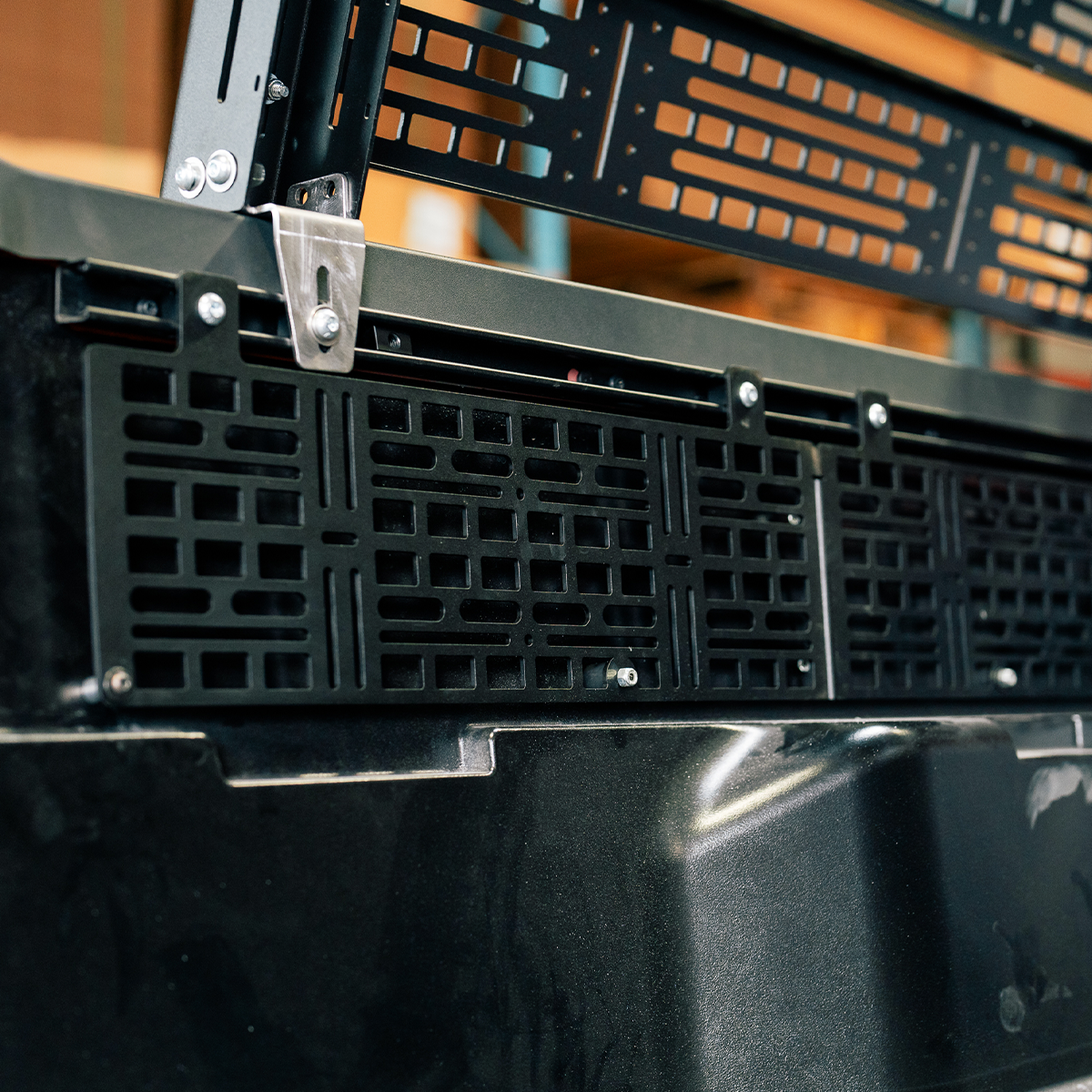 Take advantage of that extra space by converting the sides of your truck bed with our custom-designed MOLLE panel system. Laser-cut and bent to perfection providing a seamless fit, and as always, professionally powder coated to protect against corrosion. Our mounts are designed to be strong but light and extremely versatile to allow you to mount anything from MOLLE bags, trail gear, tools, high lift jacks, axes, shovels, and more for use on the road and trail. Combine all these great features with our 2-year warranty on all vehicle mounting systems so you can drive into the wilderness well-equipped.